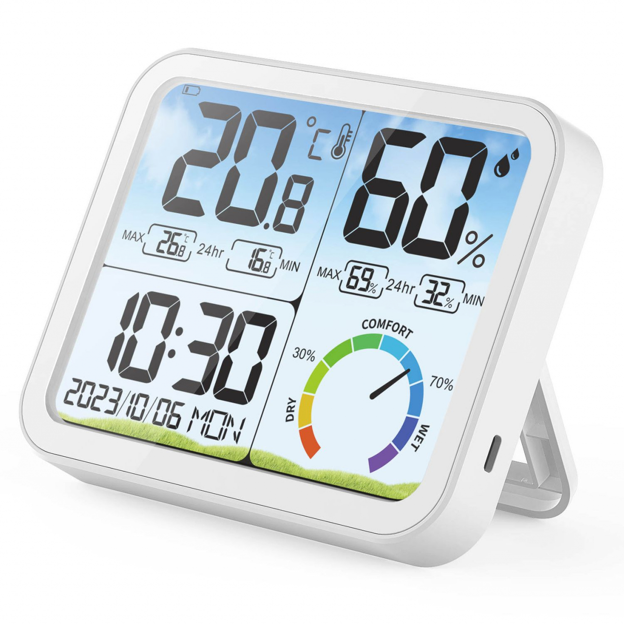 Termometrul si higrometrul te ajuta sa stii cand trebuie sa pornesti sau sa opresti racirea, incalzirea, umidificarea sau dezumidificarea in locuinta, sau sa deschizi sau sa inchizi fereastra. Poti afla care au fost cele mai mici si cele mai mari temperaturi si niveluri de umiditate din incapere in ultimele 24 de ore. De asemenea, este util sa poti vedea intotdeauna ora exacta, data si ziua saptamanii. Uneori, acest lucru poate fi de mare ajutor.